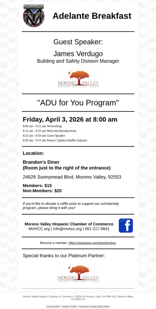 To promote, support, and encourage the advancement of Hispanic and minority owned businesses in Moreno Valley. To promote education, cultural awareness, and foster unity and communication between small businesses and our community organizations.